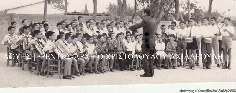 Ακκορντεόν, φυσαρμόνικα, φλογέρα, τύμπανα, δίσκους. Στις πίσω σειρές διακρίνονται μαθητές της χορωδίας. Φανταστείτε σε μια εποχή που δεν κυκλοφορούσαν πολλά αυτοκίνητα η πρόβα στην αυλή θα ήταν εύκολη και οι πέριξ γείτονες θα απολάμβαναν τη μουσική και τα τραγούδια.