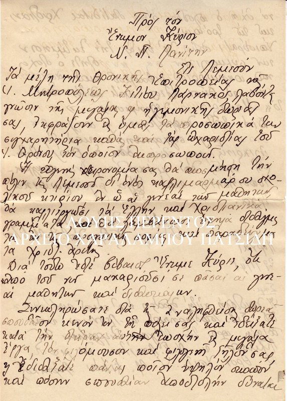 Μεταξύ άλλων χαρακτηρίζει την δωρεάν «ηγεμονική», και επισημαίνει «επισύρατε ούτω εφ’υμάς την εκτίμησιν των συμπολιτών σας, κατέστητε ο στόχος του παγκυπρίου σεβασμού και απεσπάσατε το Θείον Έλεος διότι αυτός είπε το «Μακάριοι οι ελεήμονες»,
