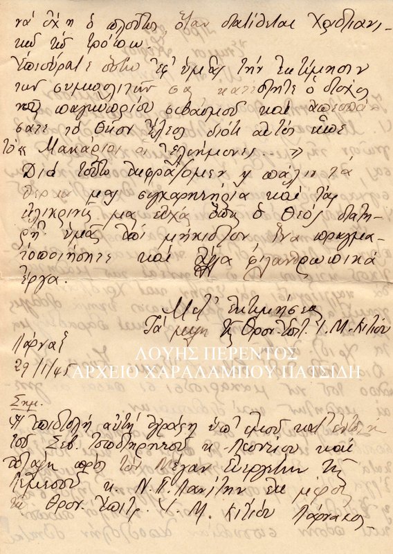 Η επιστολή ημερομηνίας 29.1.45 είναι δυσέλιδη και υπογράφουν «Μετ’εκτιμήσεως, Τα μέλη της Θρον.Επιτρ.Ι.Μ.Κιτίου».
