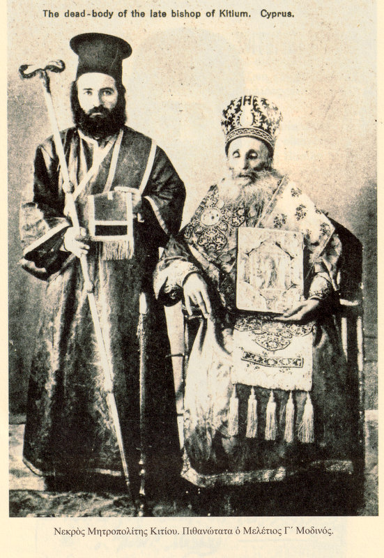 «Σώζεται αχρονολόγητη φωτογραφία ( carte-postale) νεκρού γέροντα Επισκόπου Κιτίου του 19ου αιώνα, καθισμένου σε πολυθρόνα και ντυμένου με όλα τα αρχιερατικά του άμφια, με την επιγραφή «the body of the late Bishop of Kitium, Cyprus». Πιθανότατα πρόκειται για τον νεκρό του Μελετίου Γ’Μοδινού, ο οποίος πέθανε το 1878 σε ηλικία 80 χρονών.»